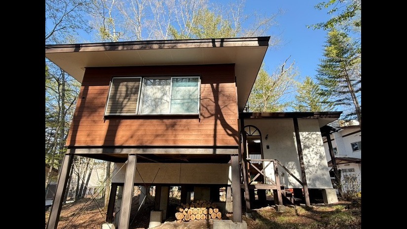 敷地100坪 2LDK薪ストーブ付 LDK無垢床 永住別荘利用者にも人気のある利便性の良い別荘地内 屋根付きウッドデッキ